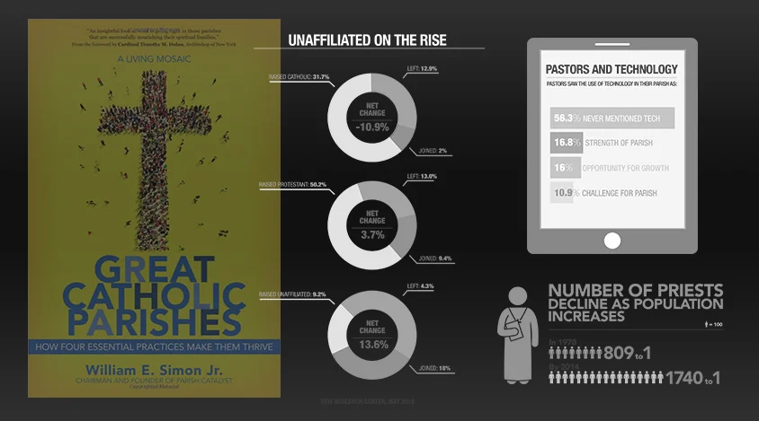 Book Infographics - Great Catholic Parishes Infographics created for William E. Simon's book Great Catholic Parishes: A Living Mosaic to support the book's content and provide visual representation of data.